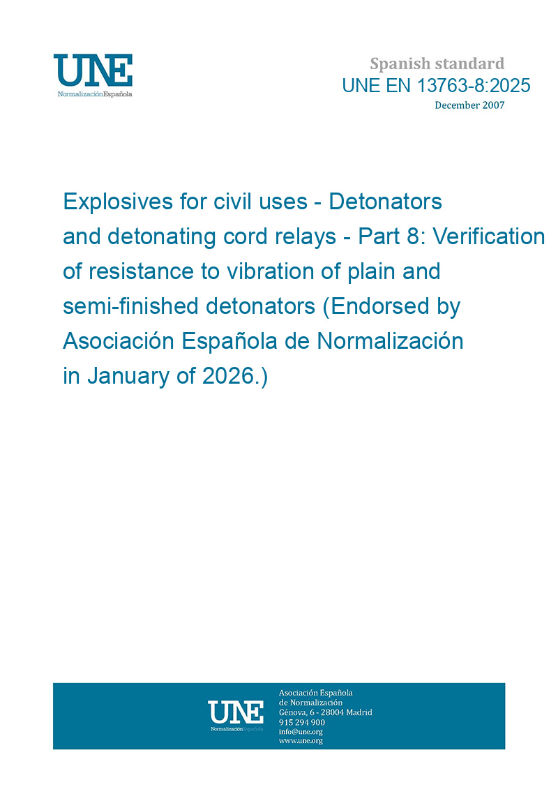 Explosivos para usos civiles. Detonadores y relés de cordón detonante. Parte 8: Verificación de la resistencia a la vibración de detonadores ordinarios y semiacabados (Ratificada por la Asociación Española de Normalización en enero de 2026.)