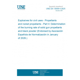 Explosivos para usos civiles. Propulsantes y propulsantes para cohetes. Parte 4: Determinación de la velocidad de combustión de propulsantes sólidos para armas y pólvora negra (Ratificada por la Asociación Española de Normalización en enero de 2026.)