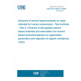 Influencia de los productos con base de cemento sobre el agua destinada al consumo humano. Métodos de ensayo. Parte 2: Influencia de los materiales con base de cemento aplicados in situ y de los productos/materiales no cementosos asociados sobre los parámetros organolépticos y la migración de los compuestos orgánicos (COT).