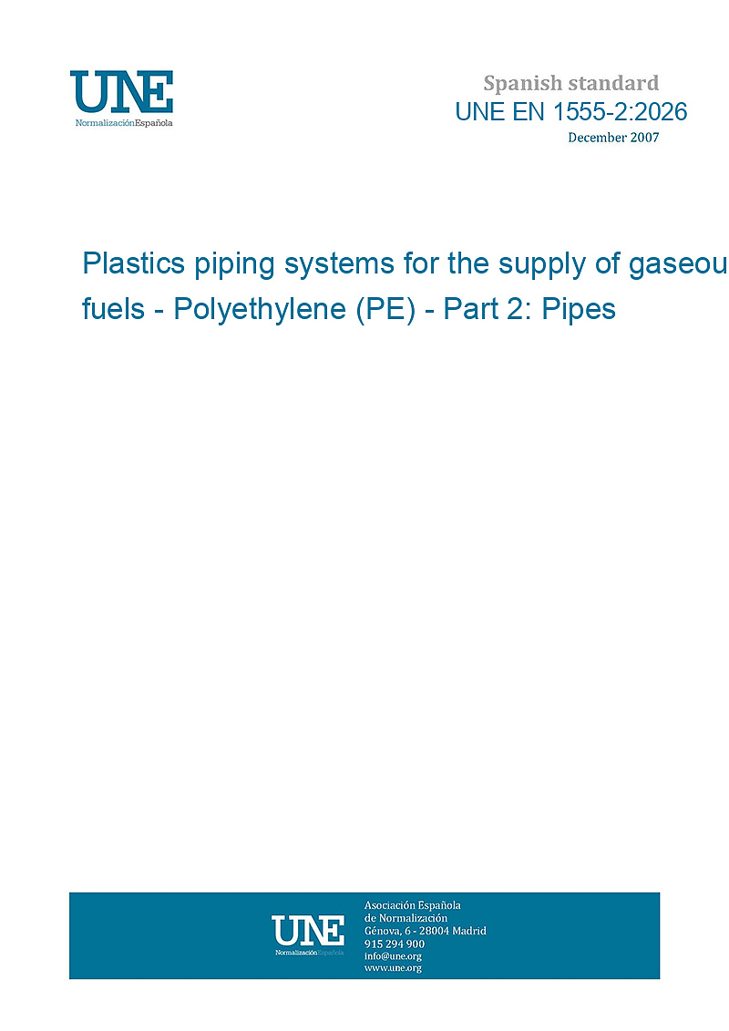 >UNE EN 1555-2:2026 - Plastics piping systems for the supply of gaseous fuels - Polyethylene (PE) - Part 2: Pipes