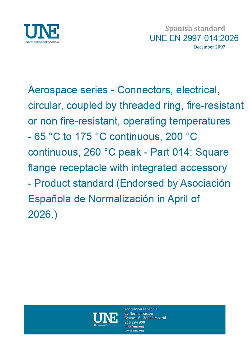 Material aeroespacial. Conectores eléctricos circulares de acoplamiento por anillo roscado, resistente o no al fuego, temperaturas de utilización de -65 ºC a 175 ºC continua, 200 ºC continua, 260 ºC en pico. Parte 014: Receptáculo con fijación por brida cuadrada con accesorio integrado. Norma de producto (Ratificada por la Asociación Española de Normalización en abril de 2026.)