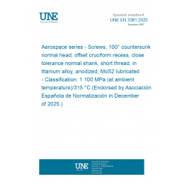 Aerospace series - Screws, 100° countersunk normal head, offset cruciform recess, close tolerance normal shank, short thread, in titanium alloy, anodized, MoS2 lubricated - Classification: 1 100 MPa (at ambient temperature)/315 °C (Endorsed by Asociación Española de Normalización in December of 2025.)