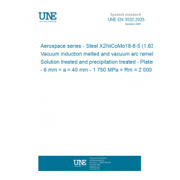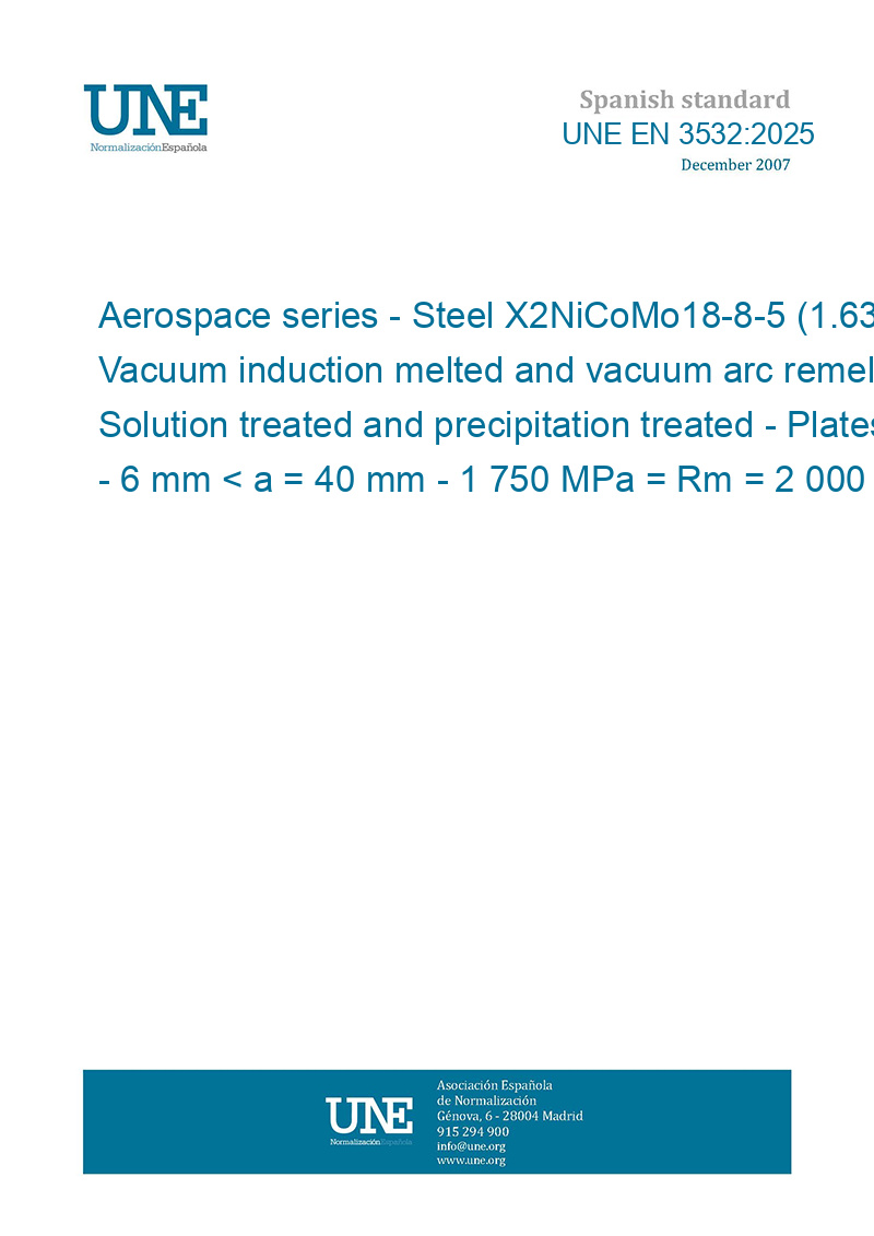 Material aeroespacial. Acero X2NiCoMo18-8-5 (1.6359). Fundido en vacío y refundido por arco en vacío. Tratado en solución y precipitación. Placas a 6 mm < a <= 40 mm - 1 750 MPa <= Rm <= 2 000 MPa (Ratificada por la Asociación Española de Normalización en octubre de 2025.)