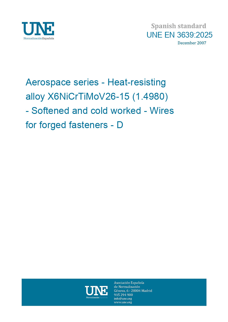 This standard UNE EN 3639:2025 Aerospace series - Heat-resisting alloy X6NiCrTiMoV26-15 (1.4980) - Softened and cold worked - Wires for forged fasteners - D <= 15 mm - 900 MPa <= Rm <= 1 100 MPa (Endorsed by Asociación Española de Normalización in January of 2026.) is classified in these ICS categories:
