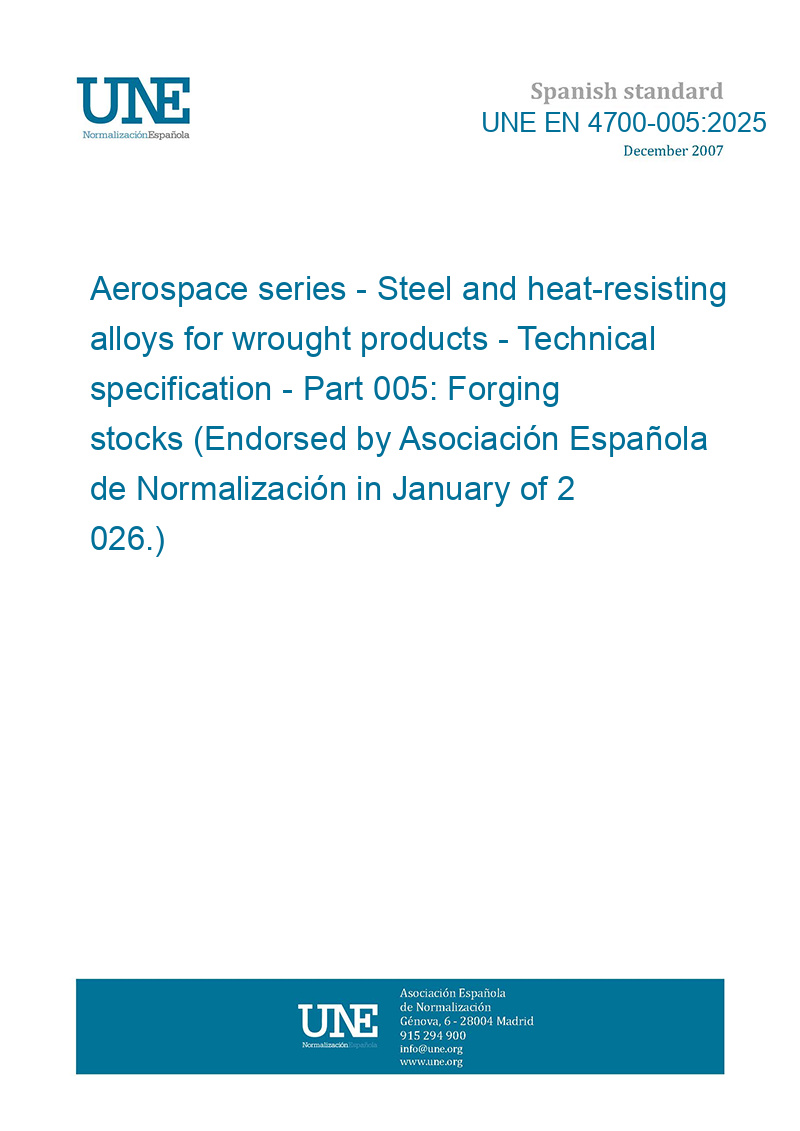 Aerospace series - Steel and heat-resisting alloys for wrought products - Technical specification - Part 005: Forging stocks (Endorsed by Asociación Española de Normalización in January of 2026.)