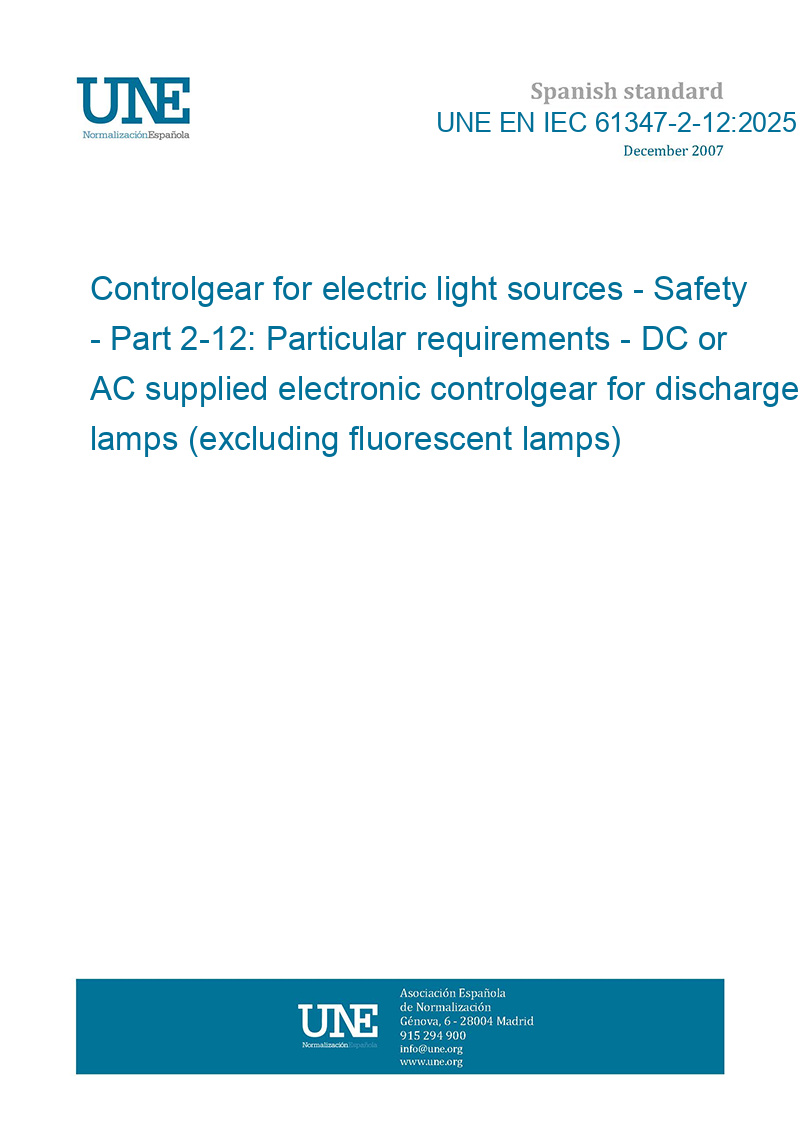 Dispositivos de control para fuentes de luz eléctrica. Seguridad. Parte 2-12: Requisitos particulares. Dispositivos de control electrónicos alimentados en corriente continua o corriente alterna para lámparas de descarga (excepto lámparas fluorescentes).