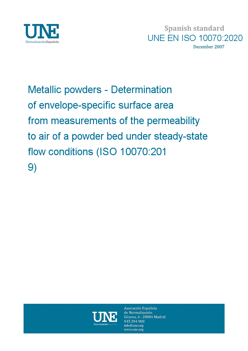 Polvos metálicos. Determinación del área de superficie específica de la envoltura a partir de las mediciones de la permeabilidad al aire de un lecho de polvo en condiciones de flujo de estado estable. (ISO 10070:2019).