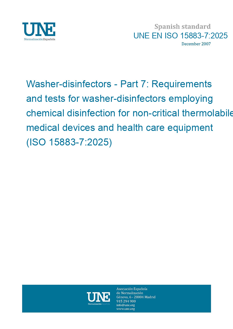 Lavadoras desinfectadoras. Parte 7: Requisitos y ensayos para las lavadoras desinfectadoras que utilizan desinfección química para los productos sanitarios termolábiles no críticos y para los equipos de asistencia sanitaria. (ISO 15883-7:2025).
