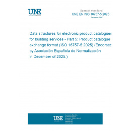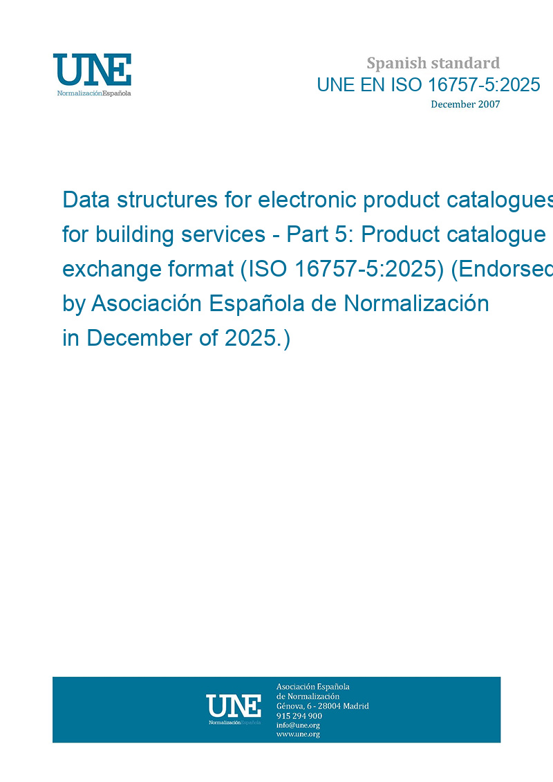 Estructuras de datos para catálogos electrónicos de productos para servicios de construcción. Parte 5: Formato de intercambio de catálogo de productos (ISO 16757-5:2025) (Ratificada por la Asociación Española de Normalización en diciembre de 2025.)