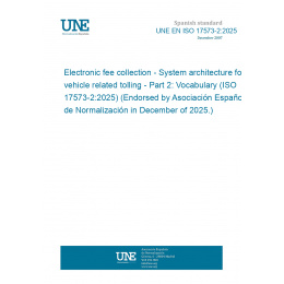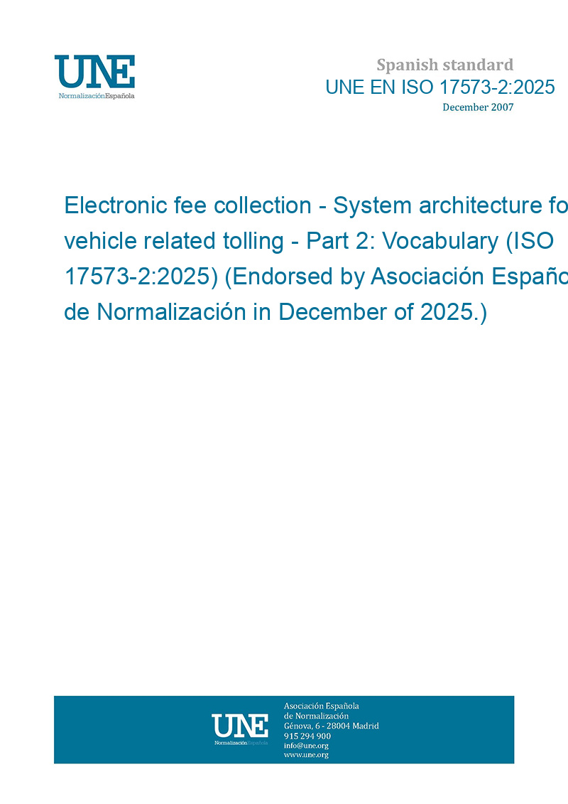 Peaje electrónico. Arquitectura del sistema para peaje relacionado con vehículos. Parte 2: Vocabulario (ISO 17573-2:2025) (Ratificada por la Asociación Española de Normalización en diciembre de 2025.)