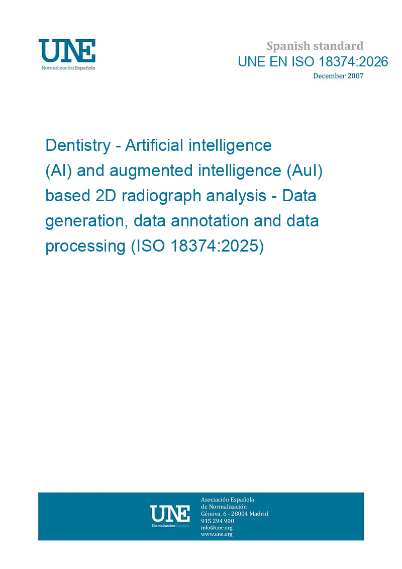 Odontología. Análisis radiográfico bidimensional basado en inteligencia artificial (IA) e inteligencia aumentada (IAu). Generación de datos, anotación de datos y tratamiento de datos. (ISO 18374:2025).