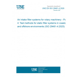 This standard UNE EN ISO 29461-4:2026 Air intake filter systems for rotary machinery - Part 4: Test methods for static filter systems in coastal and offshore environments (ISO 29461-4:2025) is classified in these ICS categories: