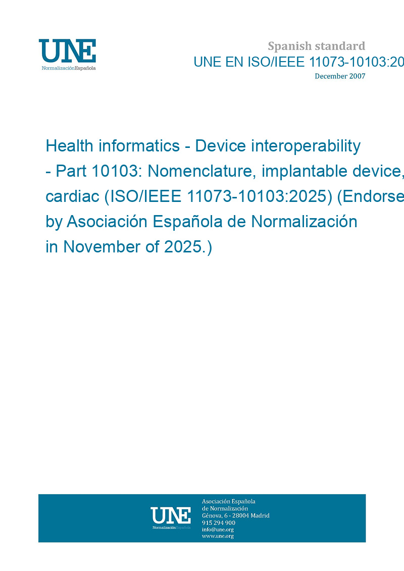 Informática sanitaria. Interoperabilidad de dispositivo. Parte 10103: Nomenclatura: Dispositivo implantable, cardiaco (ISO/IEEE 11073-10103:2025) (Ratificada por la Asociación Española de Normalización en noviembre de 2025.)
