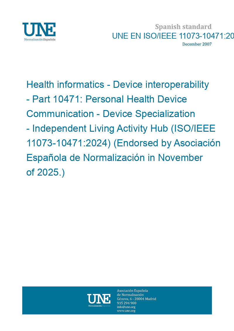 Informática sanitaria. Interoperabilidad de dispositivos. Parte 10471: Comunicaciones con productos sanitarios personales. Especialización de dispositivos. Centro de actividad para la vida independiente (ISO/IEEE 11073-10471:2024) (Ratificada por la Asociación Española de Normalización en noviembre de 2025.)